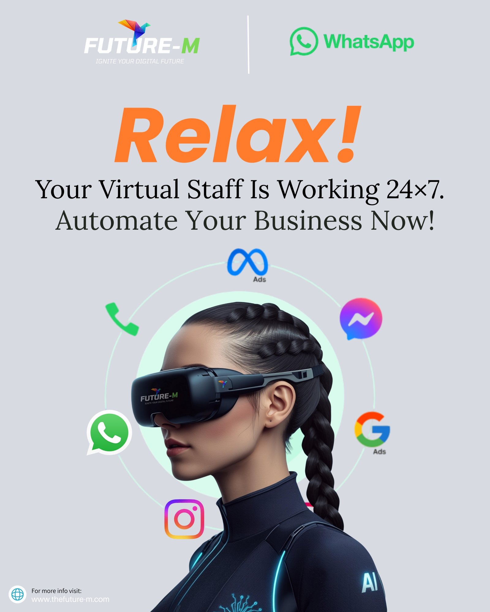 Future-M delivers intelligent business automation where technology works 24Γ7 so owners can relax. A futuristic AI assistant connects seamlessly with WhatsApp, Instagram, Meta Ads, Google Ads, and Messenger, capturing leads, automating follow-ups, and powering nonstop customer engagement. Itβs a smart digital workforce that simplifies operations, increases efficiency, and drives effortless business growth. π