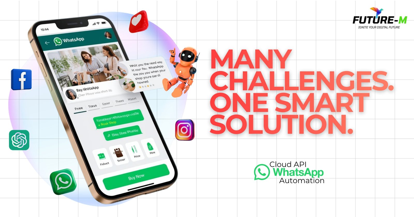 Future-M Cloud API WhatsApp Automation brings all your customer conversations into one intelligent system that works for you 24Γ7. From capturing leads instantly to sending smart auto-replies and timely follow-ups, it ensures no enquiry is ever missed. Seamlessly connected with your marketing platforms, Future-M transforms chats into conversions, reduces manual work, and helps your business grow faster with a powerful always-on digital workforce. π